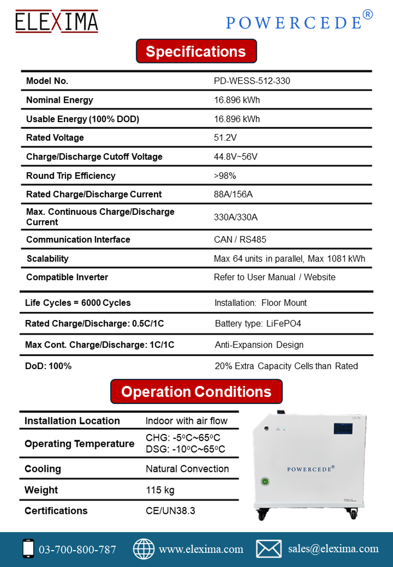 ELEXIMA POWERCEDE 51.2V 330Ah 16.896kWh Lithium Battery (LiFePO4)
